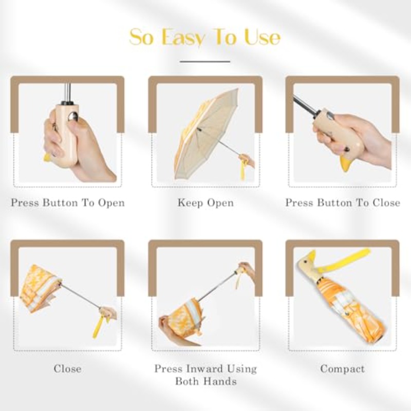 Cute Duck Umbrella Automatic | Compact Pretty Pocket Size Strong Collapsible Umbrella with Yellow Wooden Handle for Women, 6 Ribs, Material